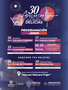 En el marco de la celebración del trigésimo aniversario de los teatros de las ciudades de Delicias y Camargo, la Secretaría de Cultura de Chihuahua invita a las presentaciones artísticas que se llevarán a cabo del 25 al 30 de junio.