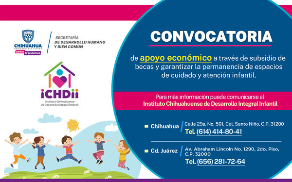 Con la finalidad de beneficiar a madres y padres de familia en el tema de estancias infantiles, la Secretaría de Desarrollo Humano y Bien Común a través del Instituto Chihuahuense de Desarrollo Integral Infantil (ICHDII), invita a los centros de atención infantil a participar en la convocatoria para recibir apoyos económicos mediante de subsidio de becas.