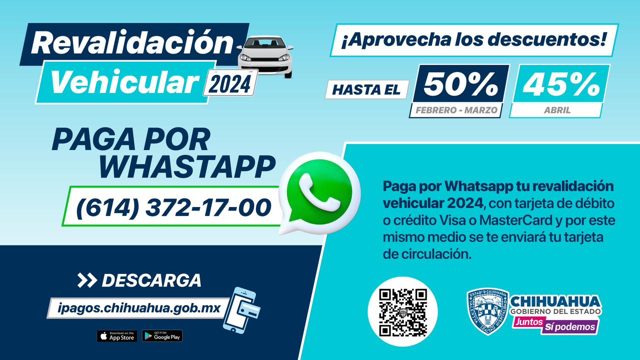Con el fin de evitar largas filas y mejorar el servicio a las y los contribuyentes, la Secretaría de Hacienda habilitó el número de Whatsapp (614) 372 1700 mediante el cual se puede consultar el adeudo vehicular, realizar su pago y ahí mismo obtener su tarjeta de circulación.