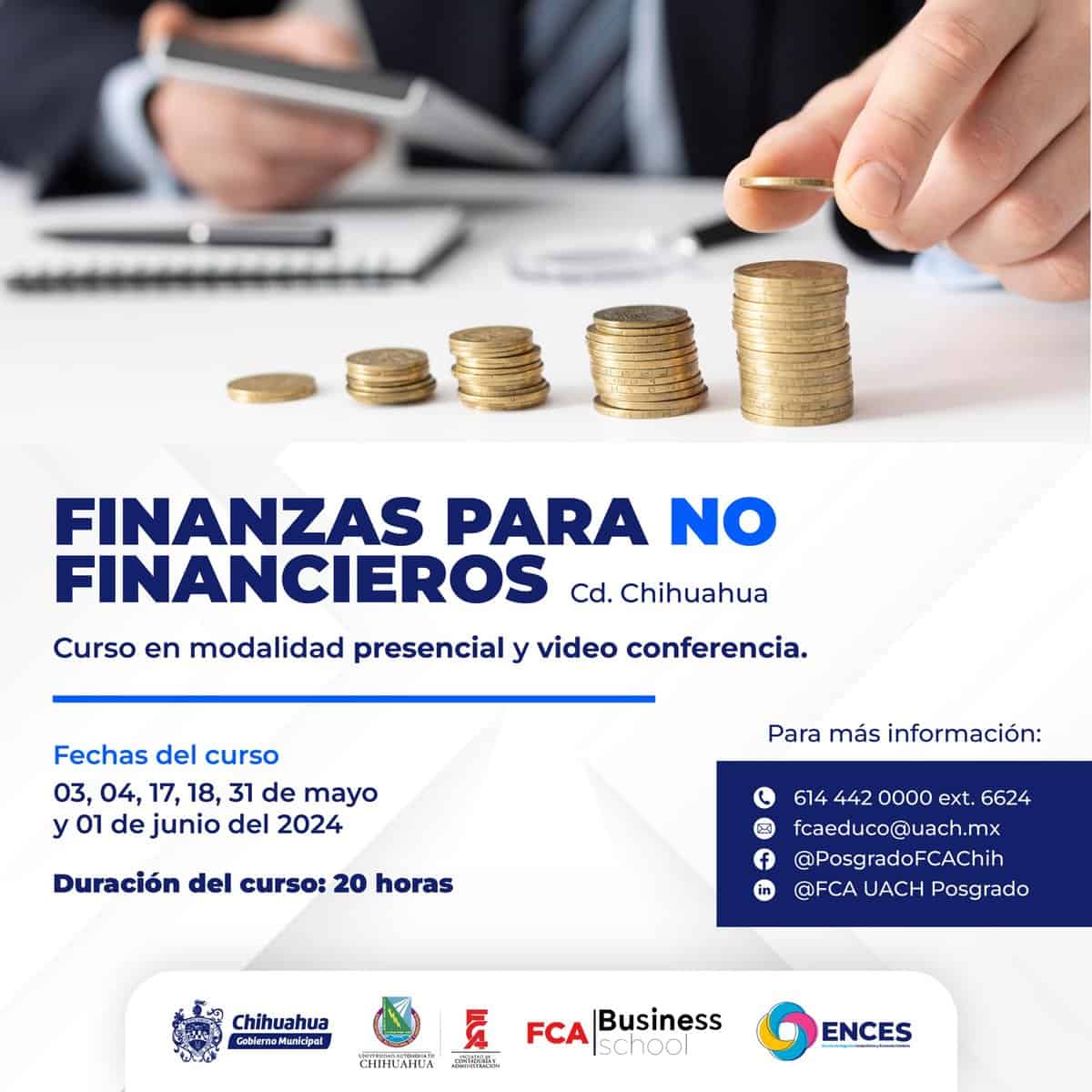 La Escuela de Negocios Competitivos y Economía Solidaria (ENCES) y la Universidad Autónoma de Chihuahua (UACH), invita a la comunidad a participar en el curso especializado “Finanzas para No Financieros”, los viernes y sábados 3, 4, 17, 18 y 31 de mayo, y el 1 de junio.