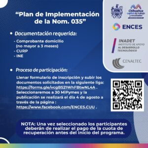 El Gobierno Municipal de Chihuahua y la Escuela de Negocios Competitivos y Economía Solidaria (ENCES), en una inversión conjunta de 435 mil pesos con el Instituto de Apoyo al Desarrollo Tecnológico (INDAET) de Gobierno del Estado, invitaron a las micro, pequeñas y medianas empresas (MIPYMES) a participar en la convocatoria “Plan de Implementación de la NOM 035”.