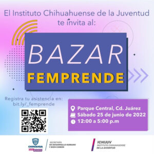 Mientras que en el Parque Central de Ciudad Juárez, el 25 de junio de 12:00 a 17:00 horas, se llevará a cabo el Bazar FEMPRENDE, que busca compartir el trabajo que realizan las mujeres chihuahuenses en el ecosistema emprendedor.