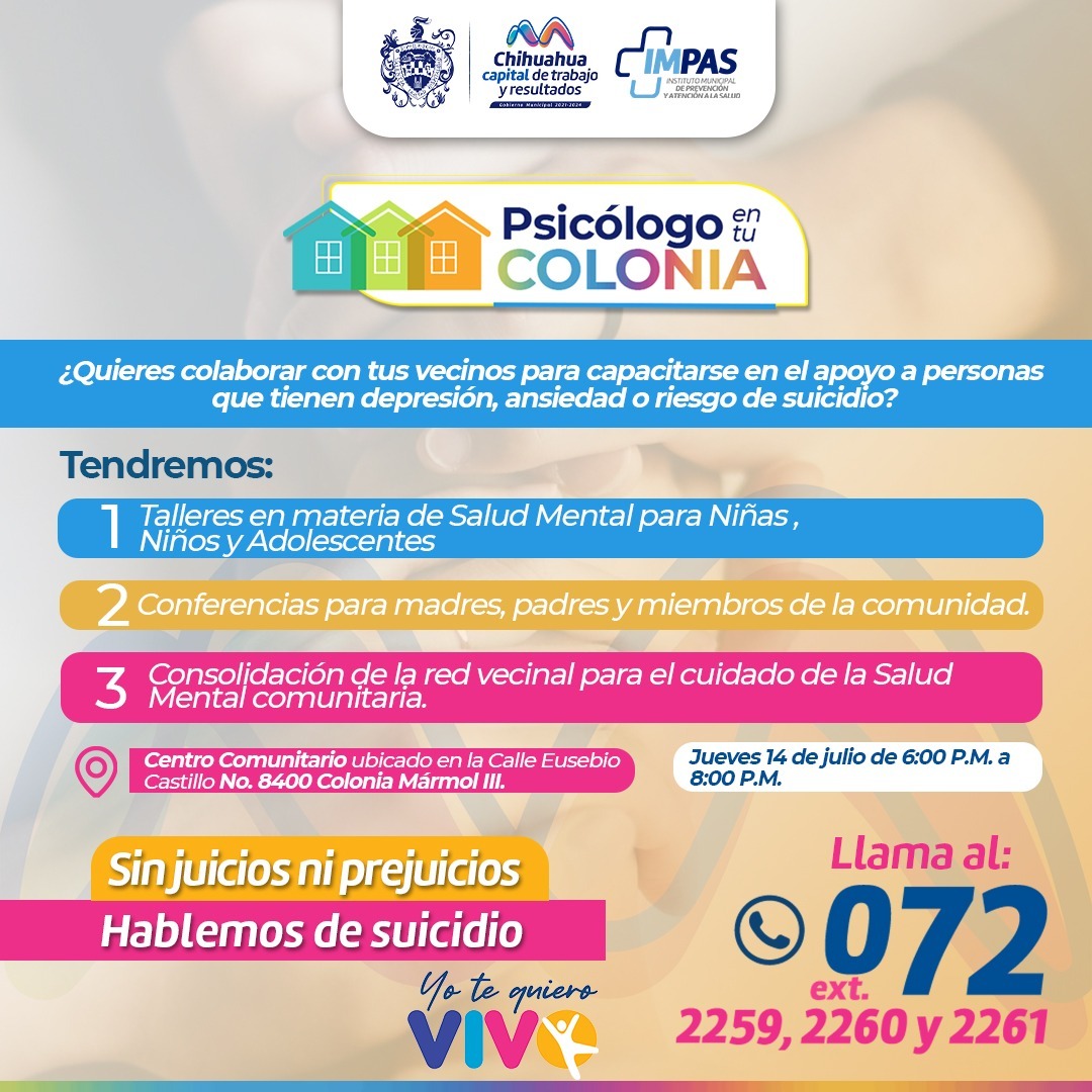 El Instituto Municipal de Prevención y Atención a la Salud (IMPAS), llevará a cabo el programa “Psicólogo en tu Colonia” como parte de la campaña “Yo te Quiero Vivo”, este jueves 14 de julio en un horario 18:00 a 20:00 horas, en las instalaciones del centro comunitario Mármol III.