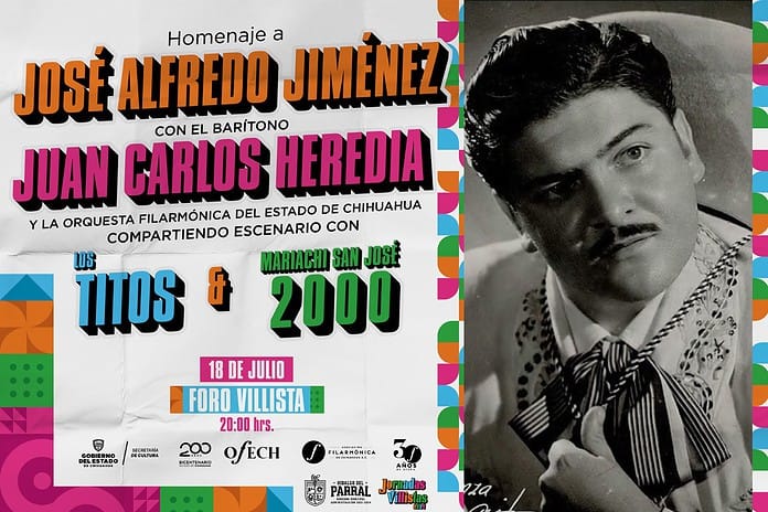 En el marco de las Jornadas Villistas, la Secretaría de Cultura de Chihuahua invita al concierto “Homenaje a José Alfredo Jiménez”, que se llevará a cabo el jueves 18 de julio a partir de las 20:00 horas, en el Foro Villista de la ciudad de Parral.