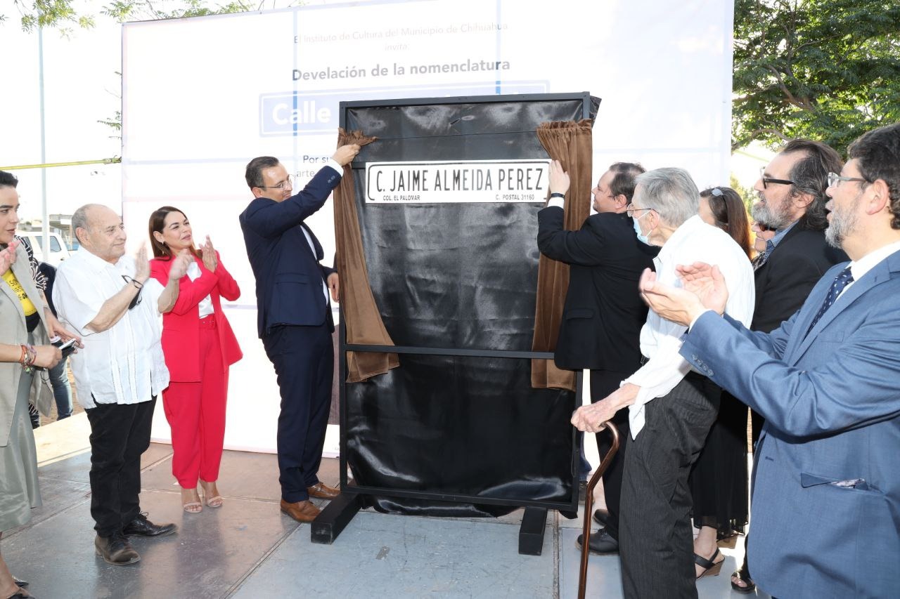 Ante la presencia de hermanos, primos y sobrinos, el alcalde Marco Bonilla acompañado de Jaime Gilberto Almeida, hijo del homenajeado y del periodista Carlos Marín, fue develada la placa con el nuevo nombre “Jaime Almeida Pérez”, antes calle del Parque ubicada en la colonia El Palomar.