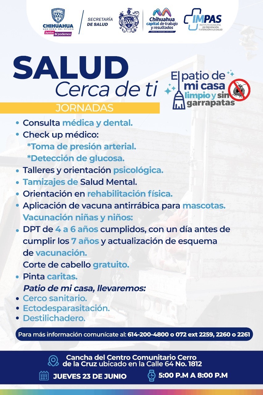 Este próximo jueves 23 de junio, de 17:00 a 20:00 horas, se llevará a cabo la “Jornada de Salud Cerca de Ti” en las canchas del Centro Comunitario Cerro de la Cruz, ubicado en la calle 64 número 1812.