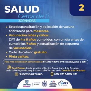 El Instituto Municipal de Prevención y Atención a la Salud (IMPAS) invita a asistir, hoy 9 de junio, a la jornada “Salud Cerca de Ti” y “Psicólogo en Tu Colonia” a las y los residentes de la colonia 2 de Octubre y sus alrededores.