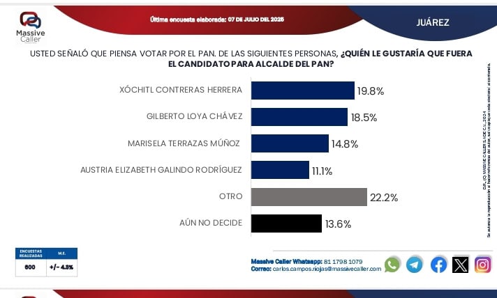 En la encuesta la diputada Xóchitl Contreras que tiene sus meritos políticos propios, encabeza con 19.8 por ciento, seguida de Gilberto Loya con un 18.5 por ciento y la exdiptuada Marisela Terrazas con un 14.8 por ciento mientras que Austria Galindo obtuvo el 11.1 por ciento. En el caso de Gil, pudiera tener más puntos pero está concentrado mediaticamente en Chihuahua capital y quizas no le interesa contender por Juárez.