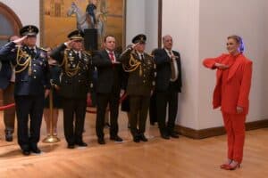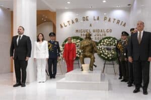 Previamente la mandataria hizo una guardia de honor en el altar a la Patria, acompañada por los secretarios de Educación y Deporte, Francisco Gutiérrez y general de Gobierno, Santiago De la Peña; la presidenta del Tribunal Superior de Justicia del Estado, Marcela Herrera y el presidente del Congreso del Estado, Guillermo Ramírez.