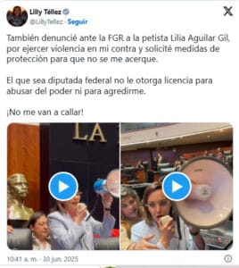 “El hecho de ser diputada federal no le otorga licencia para abusar del poder ni para agredirme”, expresó la senadora, a quien, por cierto, cientos de usuarios de redes sociales le dieron su respaldo reprobando la conducta de Lilia Aguilar.