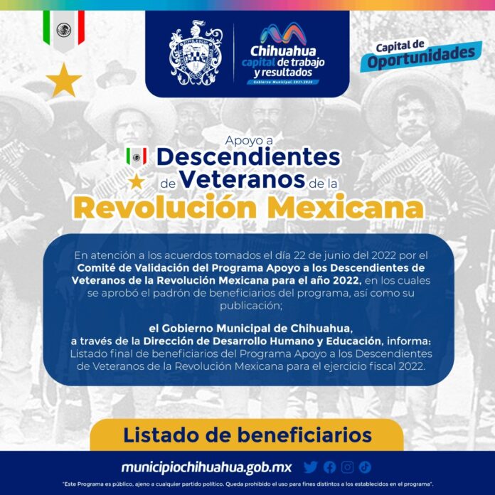 El padrón de las y los beneficiarios puede ser consultado en la siguiente liga: http://www.municipiochihuahua.gob.mx/CCS/Convocatorias/Resultados_Convocatoria_para_Apoyo_a_Descendientes_de_Veranos_de_la_Revolucion_Mexicana, o en la páginas oficiales de Facebook del Gobierno Municipal y de la Dirección de Desarrollo Humano y Educación.