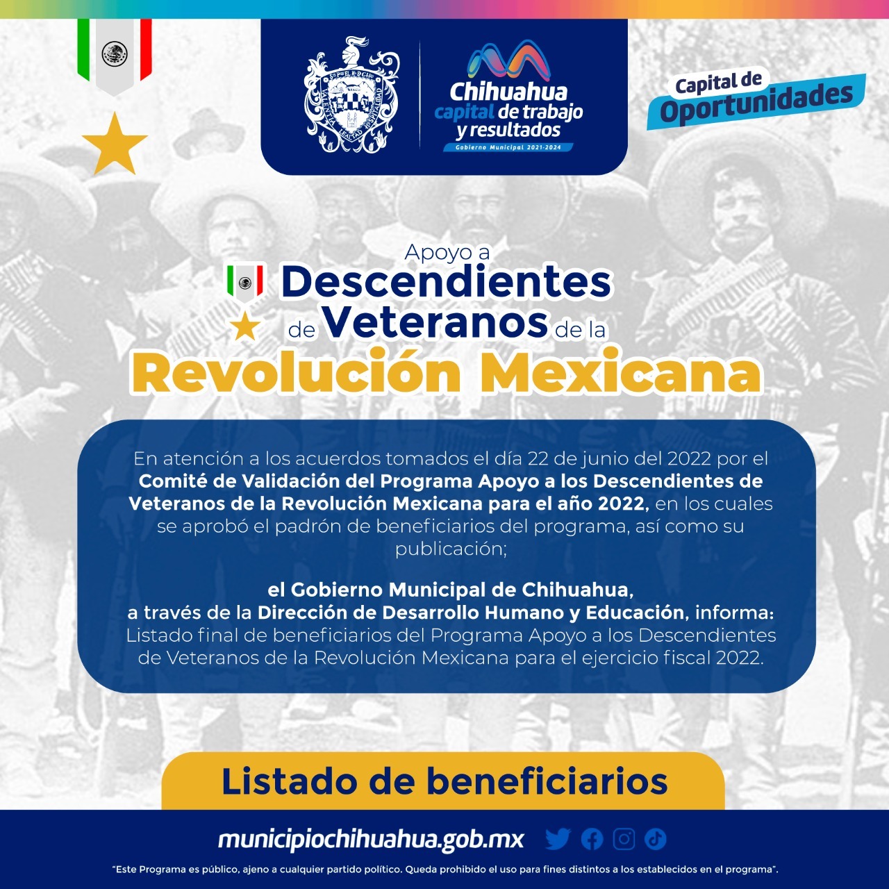 La Dirección de Desarrollo Humano y Educación, da a conocer la lista de las y los 78 beneficiarios del “Programa Apoyo a Descendientes de Veteranos de la Revolución Mexicana 2022”.