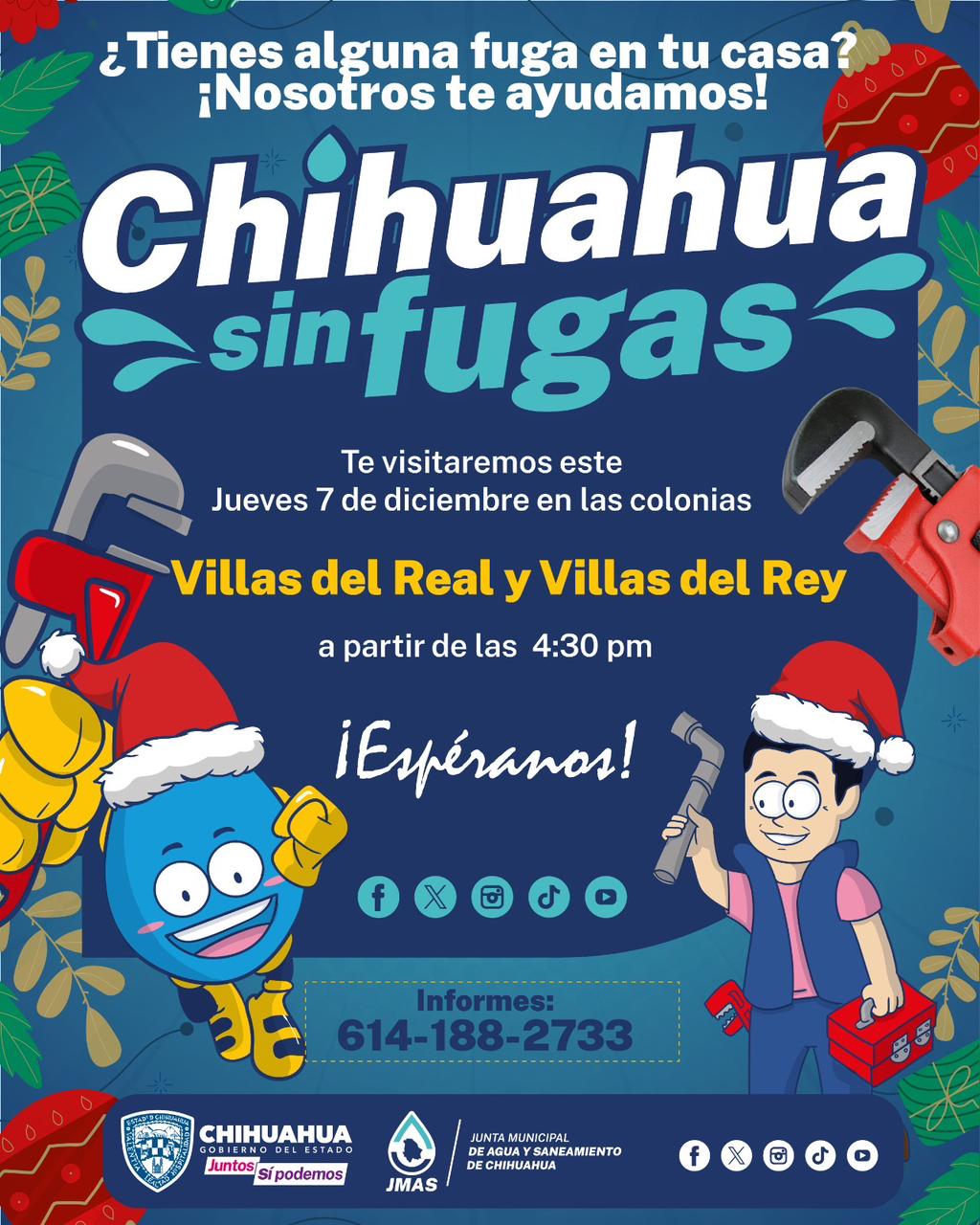 La Junta Municipal de Agua y Saneamiento (JMAS) de Chihuahua servicios del programa “Chihuahua Sin Fugas” este jueves 7 de diciembre a las 4:30 pm en las colonias Villas del Real y Villas del Rey.