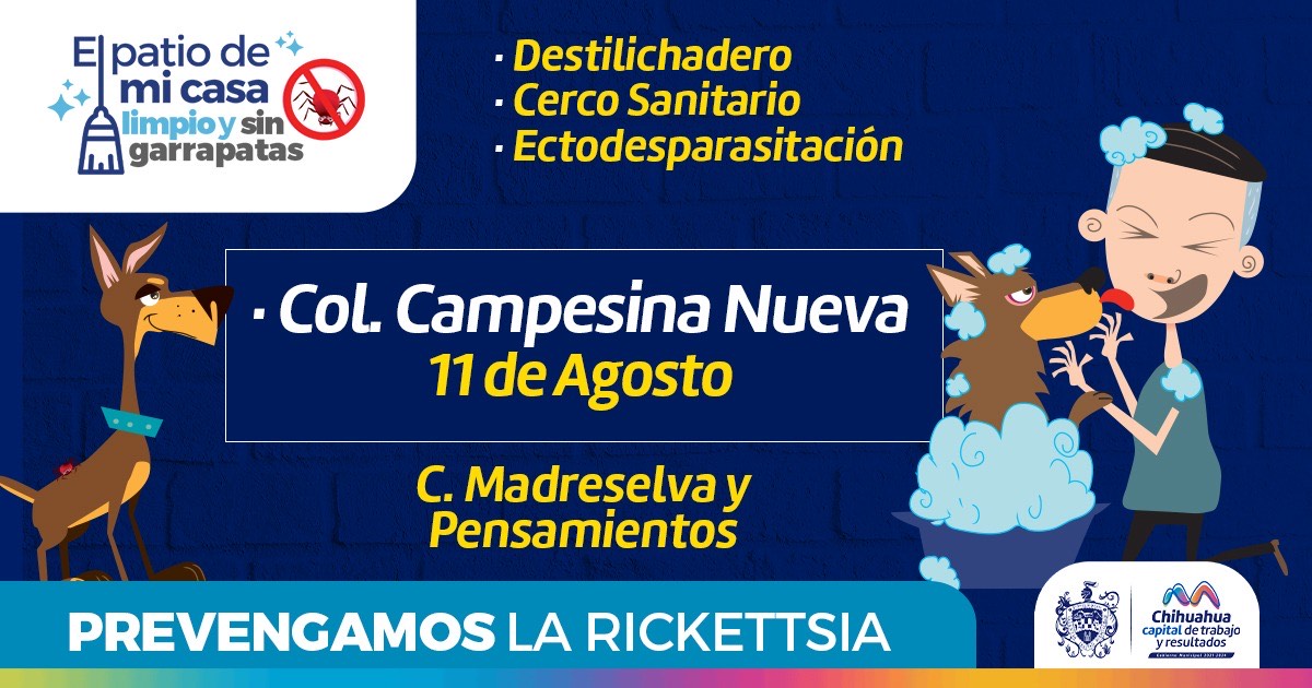 El Instituto Municipal de Prevención y Atención a la Salud (IMPAS), invita a las y los residentes de la colonia Campesina Nueva a mitigar la presencia de la garrapata haciendo uso de los servicios que componen al programa “El Patio de Mi Casa”, el próximo jueves 11 de agosto, entre las calles Madreselva y Pensamientos, desde las 9:30 a las 13:30 horas.