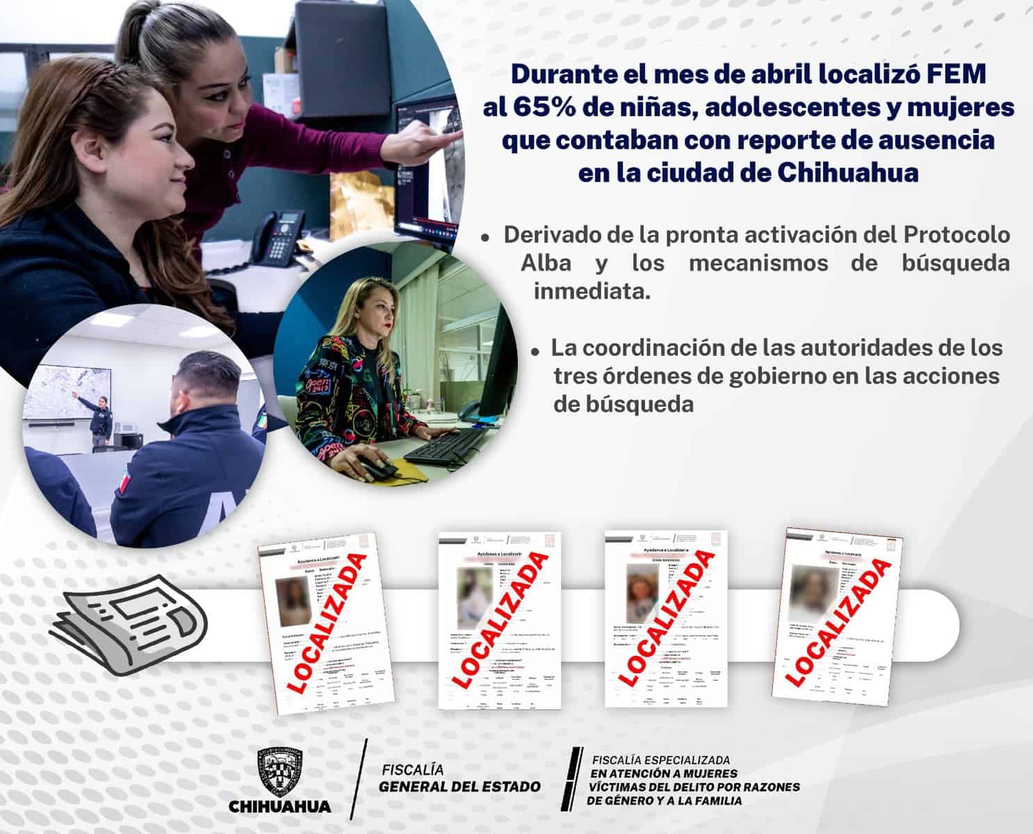 Derivado del trabajo coordinado de la Fiscalía Especializada en Atención a Mujeres Víctimas del Delito por Razones de Género y a la Familia (FEM), con autoridades de seguridad de los diferentes órdenes de Gobierno, durante el mes de abril fueron localizadas sanas y salvas, 13 niñas, adolescentes y mujeres, que contaban con reporte de ausencia en la ciudad de Chihuahua.