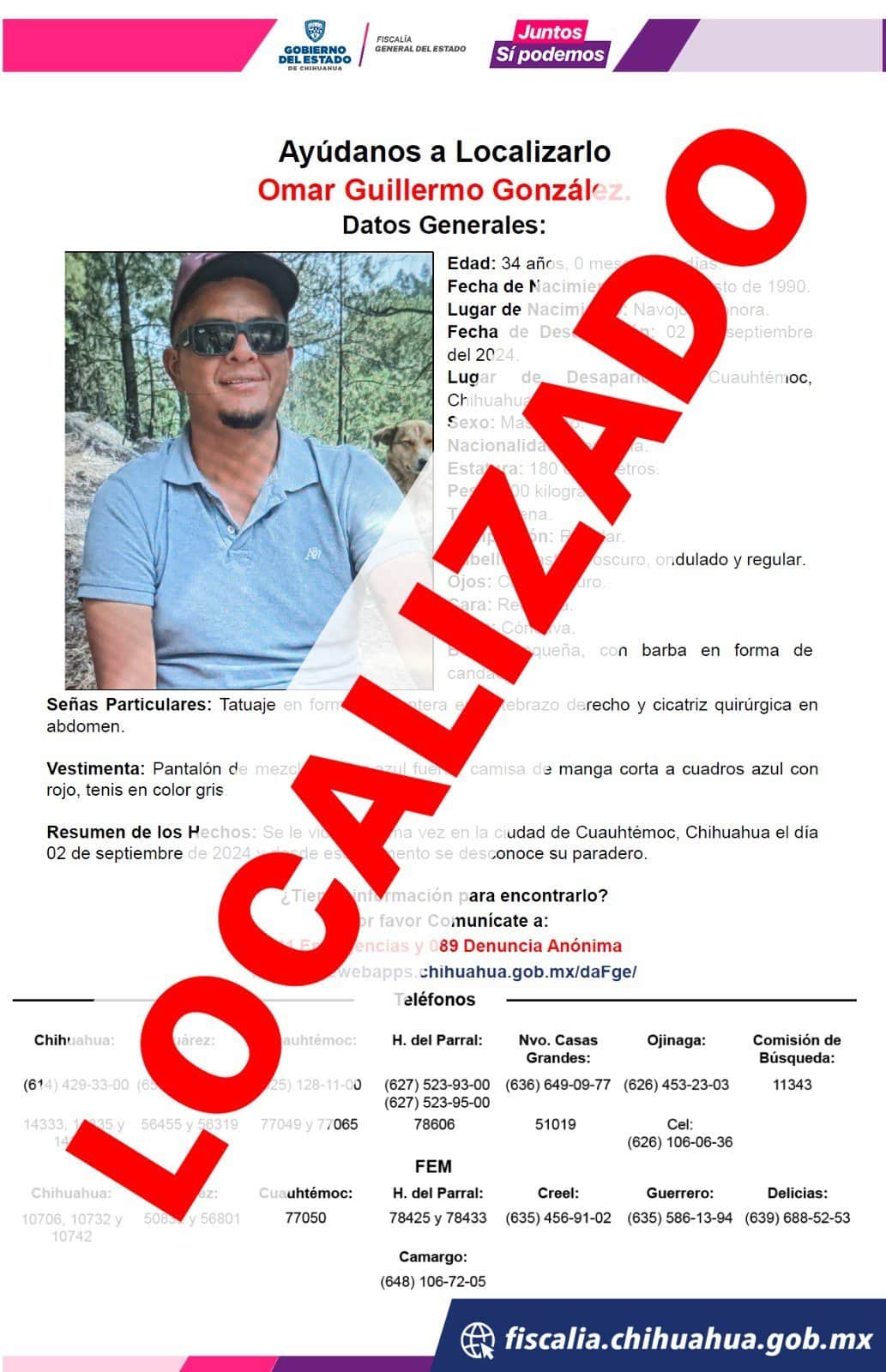 En otros hechos, fue localizado también con vida a Omar Guillermo G. de 34 años de edad, quien tenía reporte de ausencia del día 02 de septiembre, quien manifestó que andaba en Largo Maderal.
