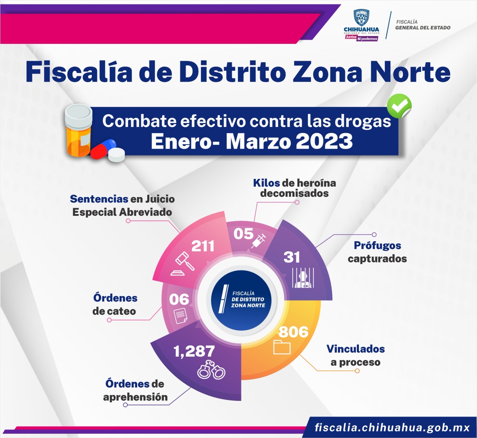 Derivado del trabajo de investigación y persecución del delito efectuado en el primer trimestre del 2023, la fiscalía zona norte, a través del Centro de Operaciones Estratégicas (COE), decomisó cinco kilos de heroína y consiguió mil 287 órdenes de aprehensión en contra presuntos responsables de delitos contra la salud en sus diversas modalidades.