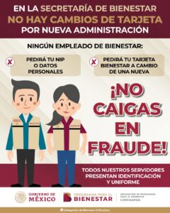 El personal de la Secretaría de Bienestar no acude a los domicilios a pedir la tarjeta ni el número de NIP.