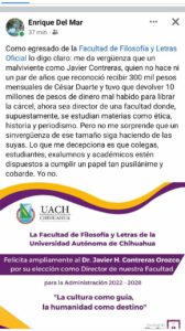 Opiniones encontradas han surgido en favor y en contra del doctor Contreras Orozco, luego del escándalo que surgió al devolver más de 10 millones de pesos que había recibido por parte de César Duarte Jáquez en la llamada “Caja Chica” que benefició a diversos personajes como políticos y periodistas.