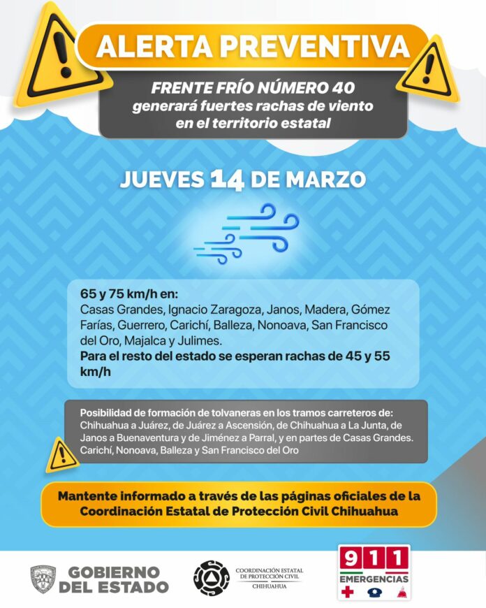 El miércoles 13 de marzo se mantienen las condiciones de fuertes vientos en el estado, con ráfagas que pueden superar los 65 y 75 en Casas Grandes, Galeana, Ignacio Zaragoza, Gómez Farías, Guadalupe, Ascensión, Janos, Nuevo Casas Grandes, Buenaventura, Madera, Namiquipa, Temósachic, Matachí, Bachíniva, Carichí, San Francisco de Borja, Cuauhtémoc, Majalca, La Cruz, Allende y Jiménez.