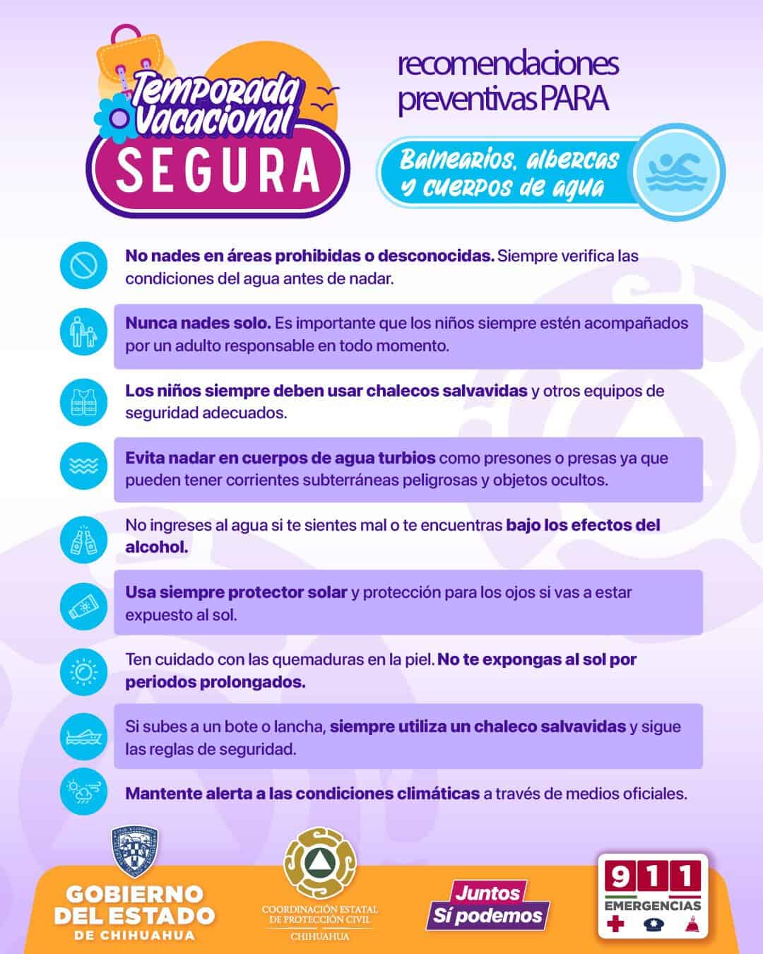 La Coordinación Estatal de Protección Civil (CEPC), exhortó a las familias chihuahuenses a seguir las medidas preventivas emitidas por las autoridades, a fin de evitar riesgos al visitar los balnearios y/o cuerpos de agua en la entidad, con motivo de las vacaciones de verano.