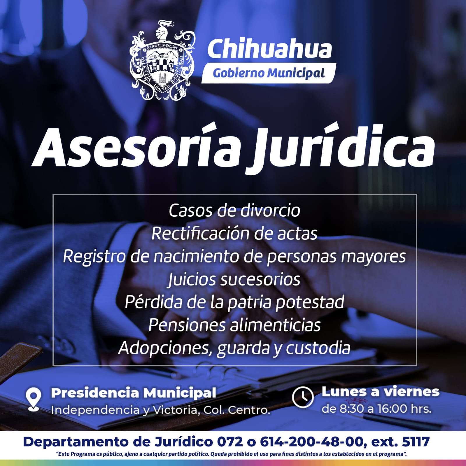 El Departamento de Asesoría Jurídica atiende de las 08:30 a 16:00 horas, de lunes a viernes, en el edificio de la Presidencia Municipal, ubicada en el cruce de las calles Independencia y Victoria, colonia Centro.