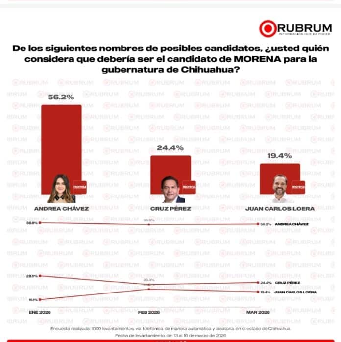 La última medición que hoy fue dada a conocer es una medición de la casa encuestadora Rubrum en la que la senadora Andrea Chávez tiene 56.2 puntos contra 24.4 del alcalde Cruz Pérez Cuéllar y un 19.4 del senador Juan Carlos Loera.