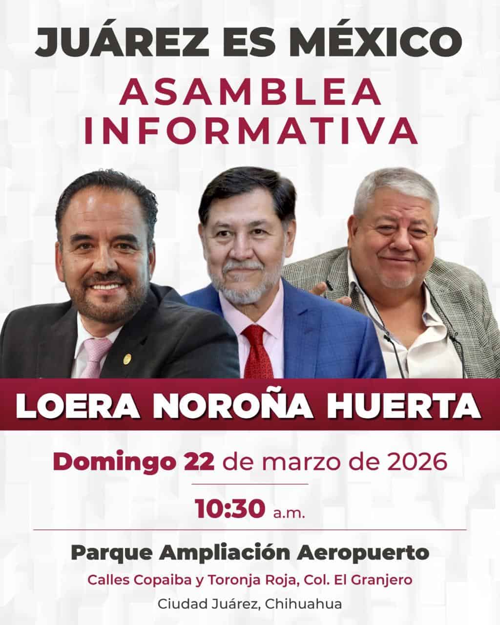 Vendrán a Ciudad Juárez los senadores Gerardo Fernández Noroña y Manuel Huerta para acompañar a Loera de la Rosa en una asamblea informativa denominada “Juárez es México”, en la que el senador juarense hablará con los asistentes sobre las iniciativas que ha presentado, la intención de sus votos y las acciones en favor de la frontera.