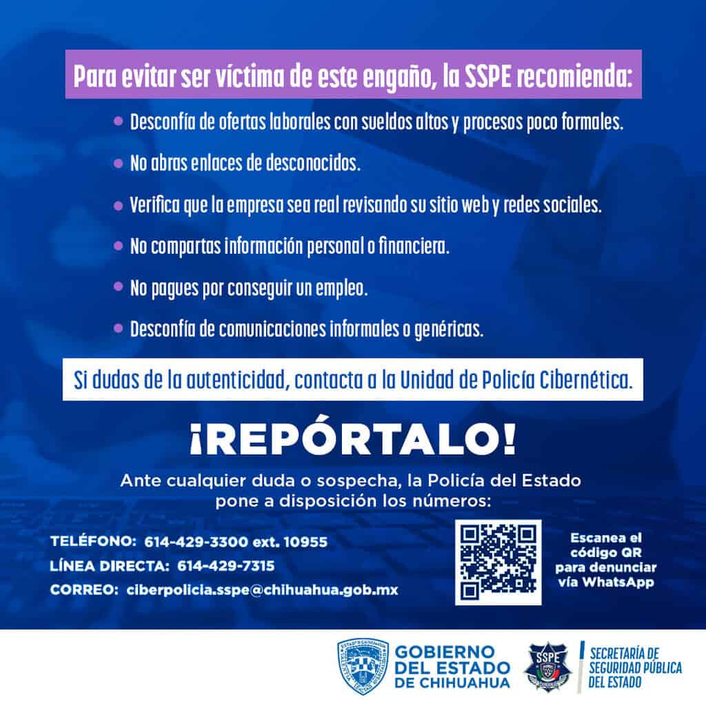 Ante cualquier duda o sospecha, la Policía del Estado pone a disposición el número 614-429-3300 extensión 10955, el número directo al WhatsApp 656-280-95-62, o el correo [email protected]