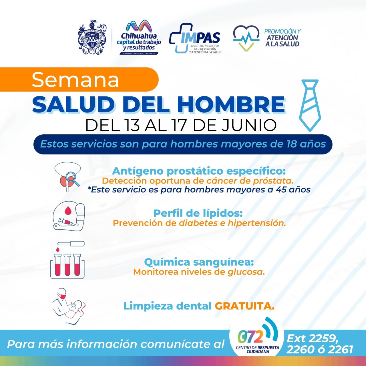 Para más información sobre los servicios del IMPAS, puede comunicarse al número 614-200-48-10 o al 072, extensiones 2259, 2260 o 2261, en un horario de 8:00 am a 8:00 pm de lunes a viernes.