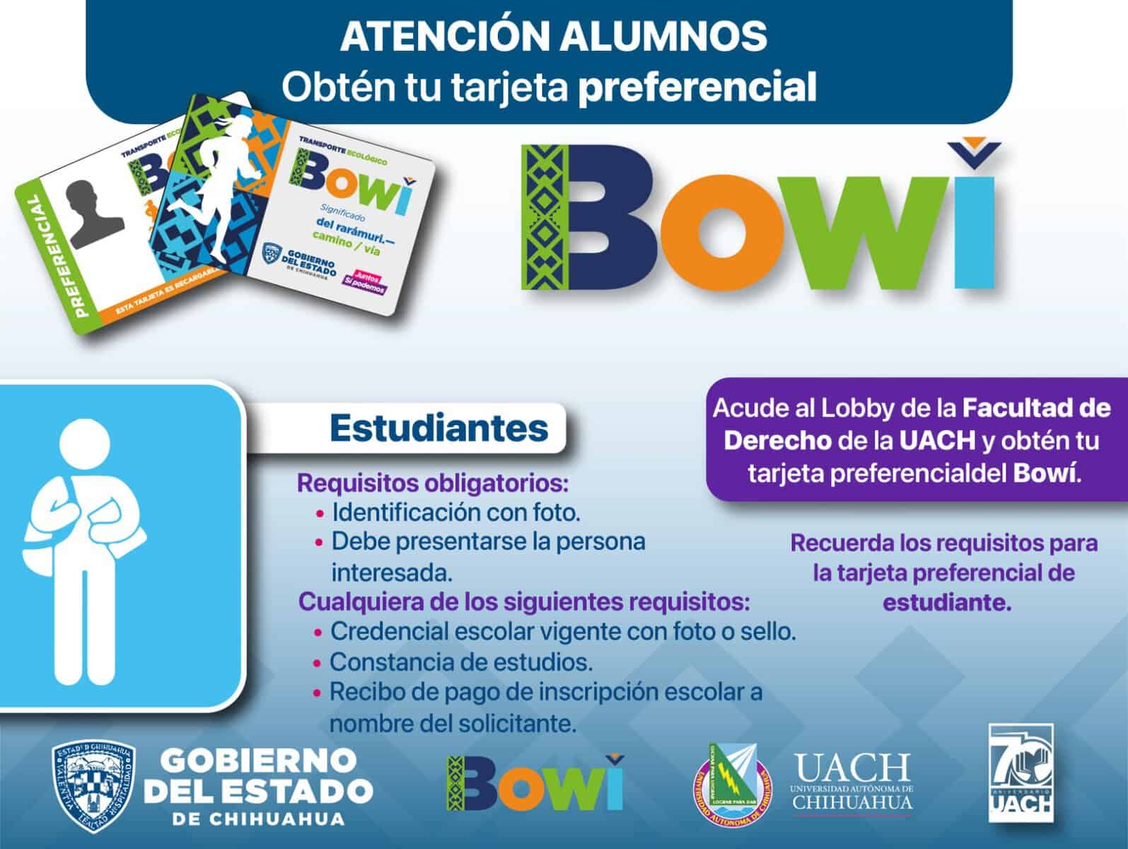La Secretaría General de Gobierno, a través de la Operadora de Transporte (OTV), anuncia la instalación de un módulo de credencialización temporal para el sistema Bowí en la Facultad de Derecho de la UACH, a partir del martes 17 de septiembre.