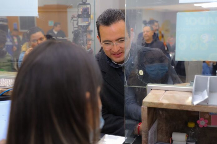 El alcalde Marco Bonilla Mendoza, acudió la mañana de este 2 de enero a las cajas de la Tesorería a realizar el pago del predial de su casa e invitó a toda la ciudadanía a aprovechar durante el mes de enero el 12 por ciento de descuento en este impuesto, que se utiliza en mejoras de vialidades, iluminación, limpieza de calles, espacios públicos, pavimentación y recolección de basura.