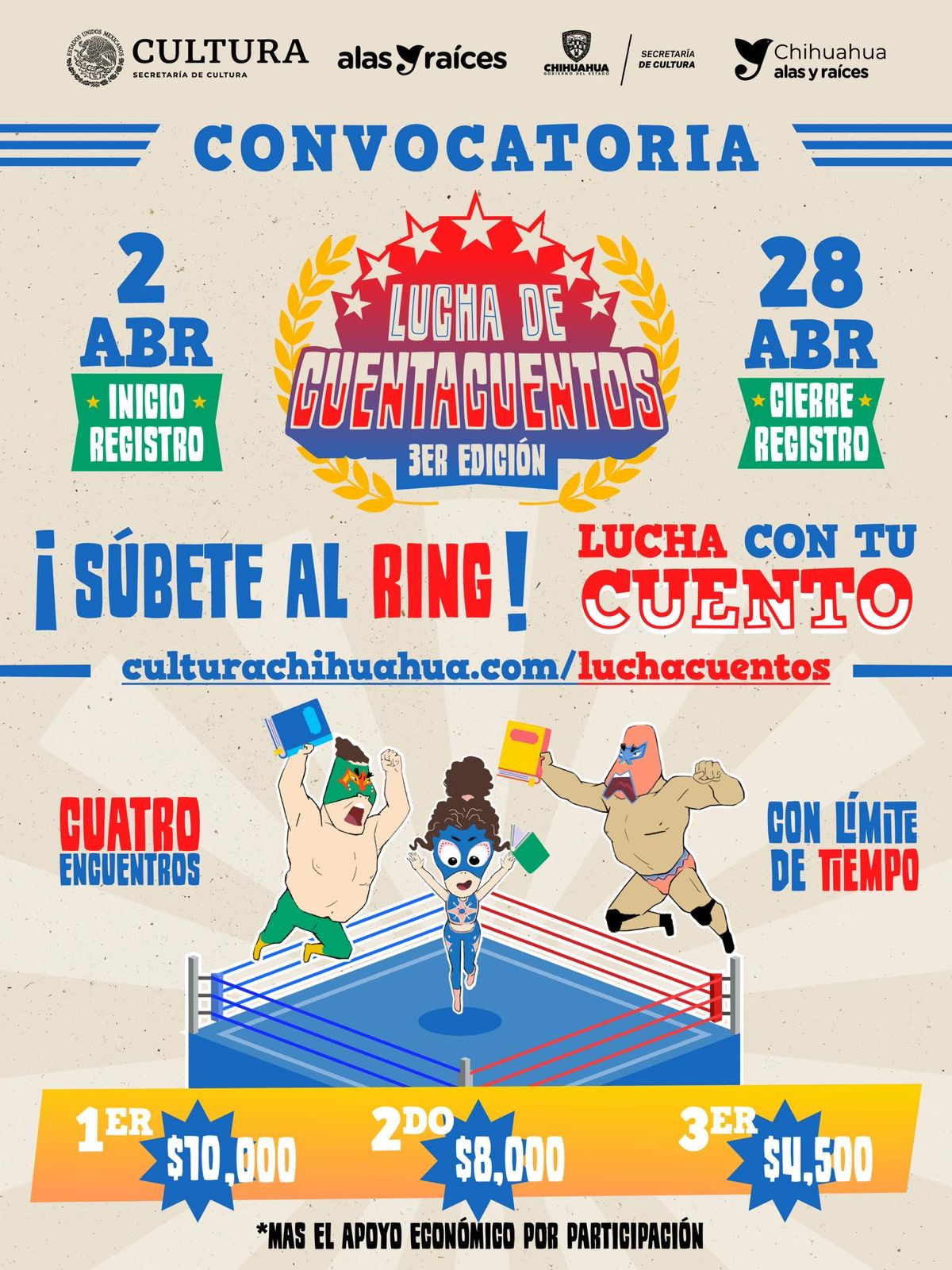 La etapa de registro se encuentra abierta hasta el domingo 28 de abril del presente año y las bases pueden consultarse en: www.culturachihuahua.com/luchacuentos.