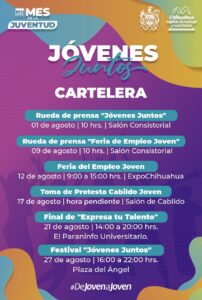 Con motivo del Día Internacional de la Juventud, que se celebra el 12 de agosto, a lo largo del mes se tendrán diferentes actividades que tienen la finalidad de fomentar la convivencia y motivar a los jóvenes chihuahuenses para que muestren sus talentos artísticos, disfruten de conciertos, conozcan ofertas laborales o se involucren en la vida pública de Chihuahua.