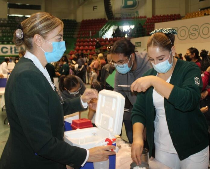Personal de Enfermería y Médicos del Instituto Mexicano del Seguro Social (IMSS) en Chihuahua participan en la aplicación de la segunda dosis de la vacuna contra el COVID-19, para las niñas y los niños de 5 a 11 años de edad, que se lleva a cabo en las instalaciones del Gimnasio del Colegio de Bachilleres, ubicado en la Av. Tecnológico y calle Don Pedro Meneses, en Ciudad Juárez.