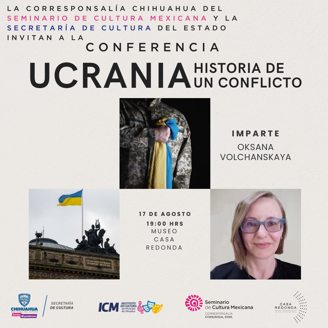La Secretaría de Cultura del Estado de Chihuahua, en coordinación con el Seminario de Cultura Mexicana, corresponsalía Chihuahua y el Instituto de Cultura del Municipio, invita a la conferencia “Ucrania: historia de un conflicto”  a cargo de la periodista de origen ucraniano radicada esta entidad, Oksana Volchanskaya.