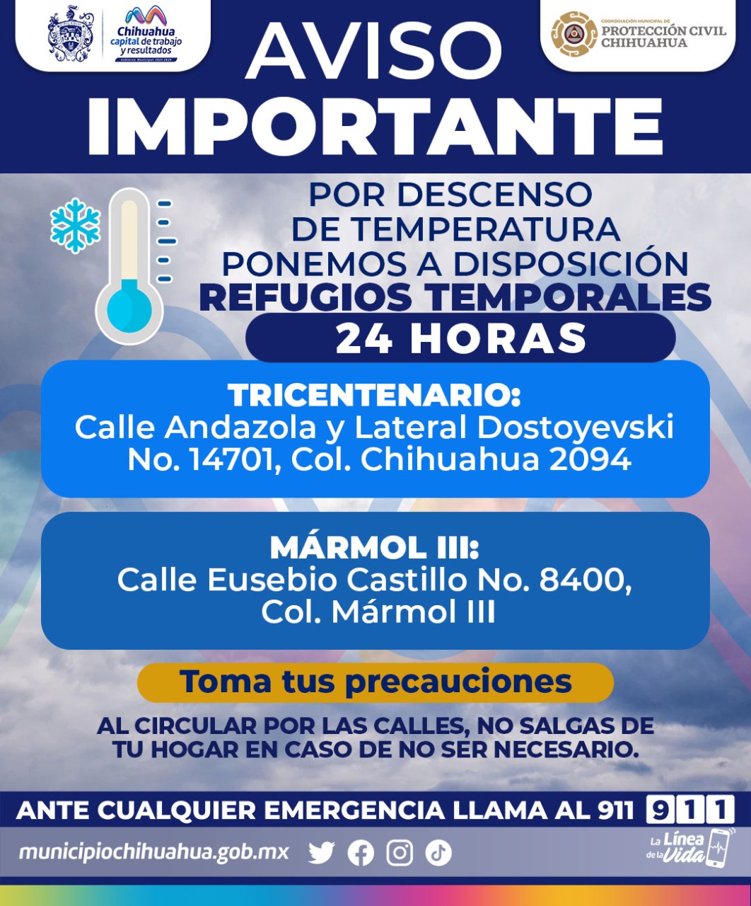 El Gobierno Municipal de Chihuahua informa que debido a las bajas temperaturas que prevalecen en la ciudad los Refugios Temporales estarán abiertos las 24 horas a partir de hoy y hasta nuevo aviso.