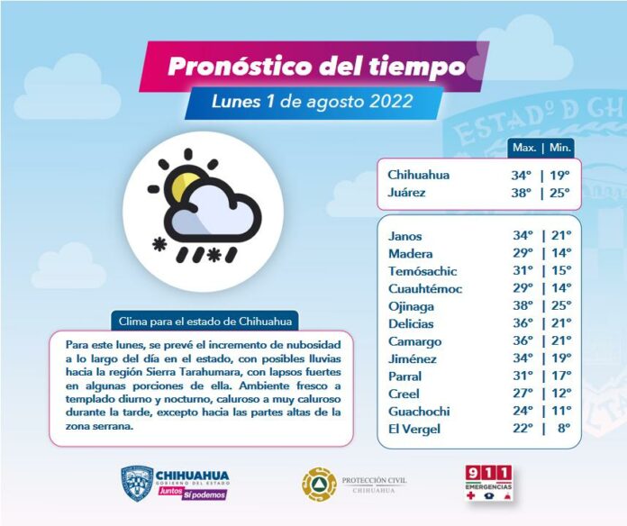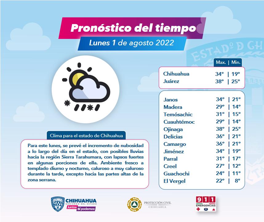 Respecto a las temperaturas, el pronóstico indica, valores dentro de los 20 a los 28 grados centígrados sobre la sierra Tarahumara y de 30 hasta 39 grados en el resto del estado; las más altas temperaturas se presentarán en la región fronteriza.