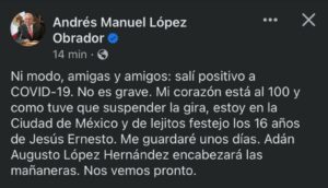 “Ni modo, amigas y amigos: salí positivo a COVID-19. No es grave. Mi corazón está al 100 y, como tuve que suspender la gira, estoy en la Ciudad de México y de lejitos festejo los 16 años de Jesús Ernesto.