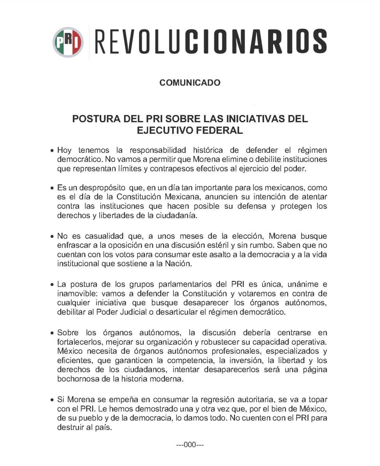 • La postura de los grupos parlamentarios del PRI es única, unánime e inamovible: vamos a defender la Constitución y votaremos en contra de cualquier iniciativa que busque desaparecer los órganos autónomos, debilitar al Poder Judicial o desarticular el régimen democrático.
