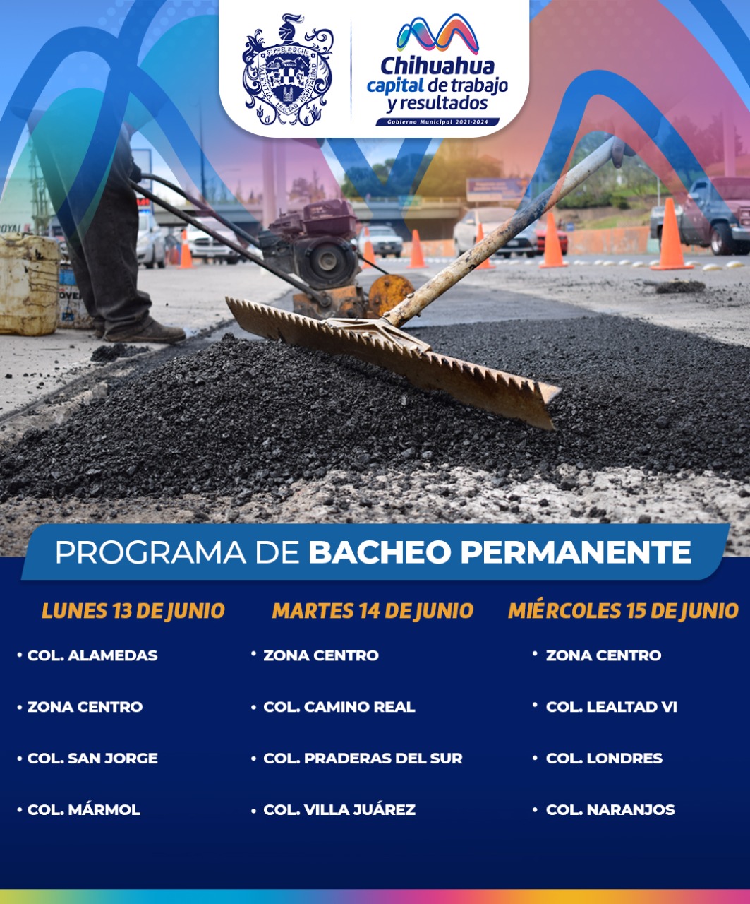 La Dirección de Obras Públicas pide a los conductores tomar precauciones por los trabajos de bacheo que realizará los próximos tres días, del 13 al 15 de junio, en diferentes avenidas y calles de la ciudad, a fin de evitar contratiempos.