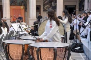 El evento se desarrolló en el Patio Central de Palacio de Gobierno, donde las participantes, bajo la dirección de la maestra Melodía Gaytán, dieron muestra del trabajo académico y artístico del modelo educativo “Música en mi Escuela”.
