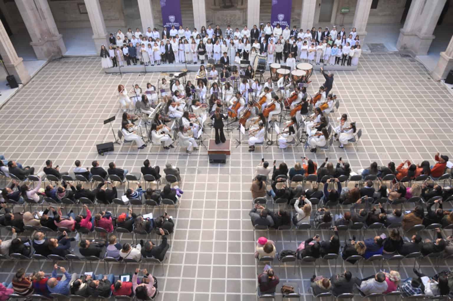 El evento se desarrolló en el Patio Central de Palacio de Gobierno, donde las participantes, bajo la dirección de la maestra Melodía Gaytán, dieron muestra del trabajo académico y artístico del modelo educativo “Música en mi Escuela”.