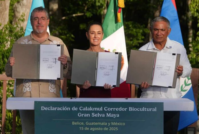 En Campeche, durante un encuentro histórico con el Presidente de Guatemala Bernardo Arévalo y el primer ministro de Belice, John Briceño, firmó un acuerdo sin precedentes para la creación del Corredor Biocultural Gran Selva Maya para proteger la riqueza biológica y cultural de 5.7 millones de hectáreas del bosque tropical más importante de Mesoamérica.