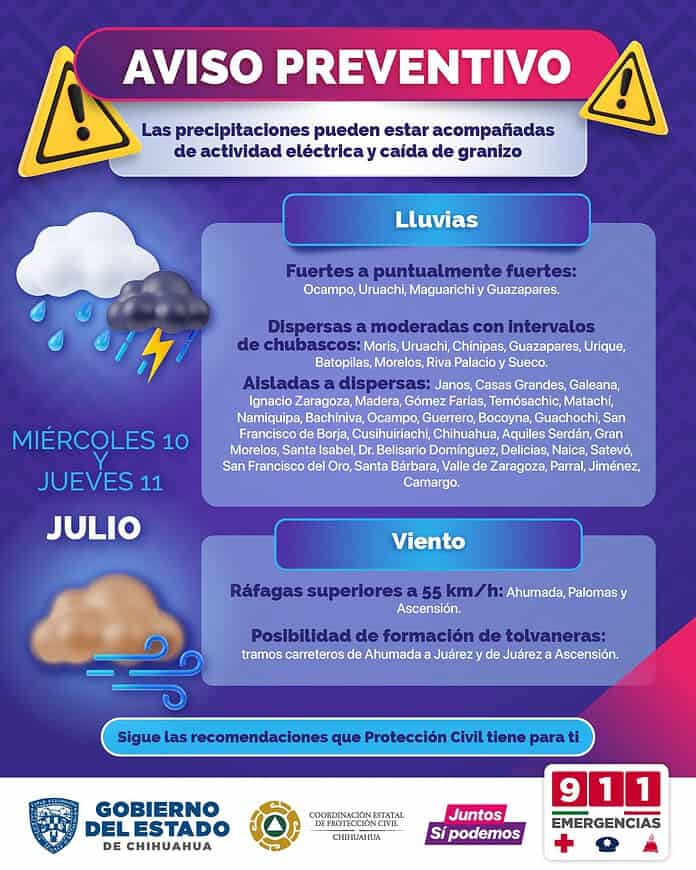 Mientras que superarán los 35 km/h en Guadalupe, Práxedis G. Guerrero, Casas Grandes, Galeana, Buenaventura, Madera, Gómez Farías, Namiquipa, Temósachic, San Francisco de Borja, Cusihuiriachi, Cuauhtémoc, Chihuahua, Rosales, Meoqui, Julimes, Satevó, Valle de Zaragoza, El Tule, Santa Bárbara, Allende, Jiménez, Coyame, Ojinaga y Manuel Benavides.