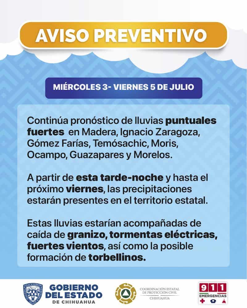 La Coordinación Estatal de Protección Civil (CEPC), informó que para la tarde de este miércoles 3 y durante el jueves 4 de julio, se pronostica presencia de lluvias de fuertes a puntuales en el estado, principalmente en municipios de la Sierra Tarahumara.