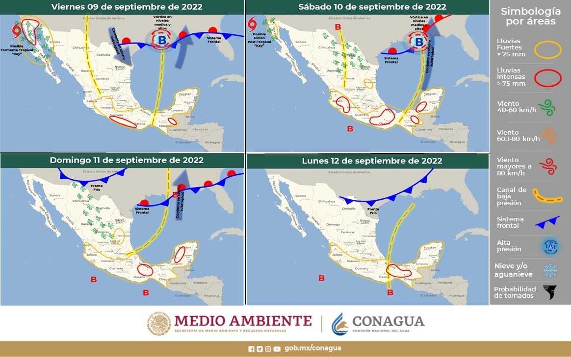 La Coordinación Estatal de Protección Civil (CEPC) informa que para este fin de semana el comportamiento de precipitación y desplazamiento previsto del huracán “Kay” se encuentra debilitándose, sin embargo aún se espera la presencia de más lluvias en algunas regiones del estado.