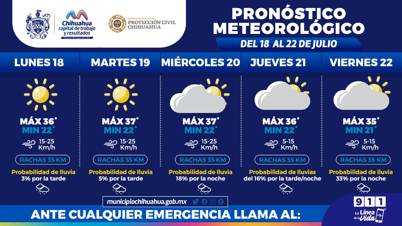 De acuerdo al pronóstico que emite el Servicio Meteorológico Nacional de CONAGUA, para este lunes se espera una máxima de 36°C y una mínima de 22°C con vientos de hasta 35 kilómetros por hora con un cielo mayormente soleado con tres por ciento de probabilidad de lluvia por la tarde, por otra parte; para el martes se prevé una máxima de 37°C y mínima de 22°C con vientos de hasta 35 kilómetros por hora con un cielo mayormente soleado con una probabilidad de lluvia de cinco por durante la tarde – noche.
