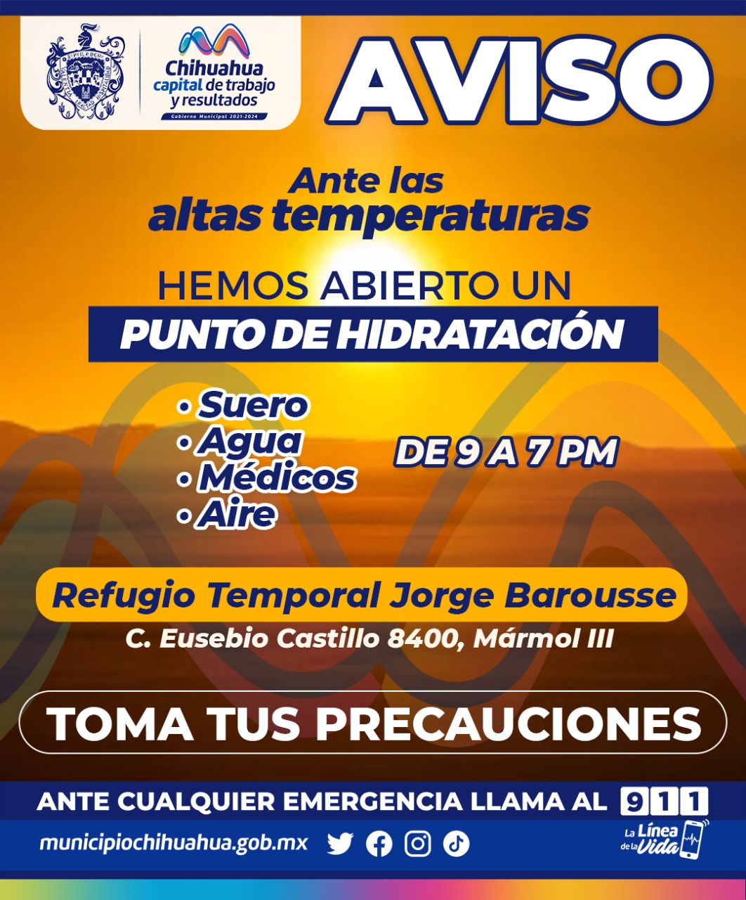 El DIF Municipal, habilitó el refugio temporal Jorge Barousse en el centro comunitario Mármol III como punto de hidratación, ubicado en la calle Eusebio Castillo número 8400, en la colonia Mármol III, ante las altas temperaturas que se han registrado en la ciudad.