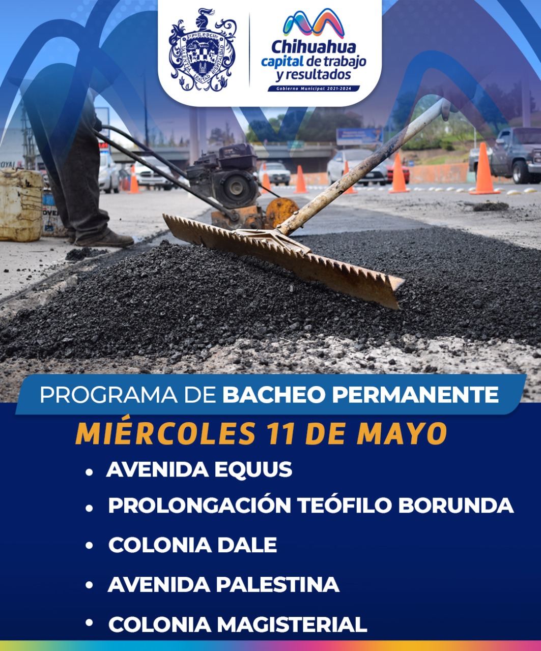 La Dirección de Obras Públicas, pide tomar precauciones a los conductores por los trabajos de bacheo que se realizará hoy 11 de mayo en diferentes avenidas y calles de la ciudad, a fin de evitar contratiempos.